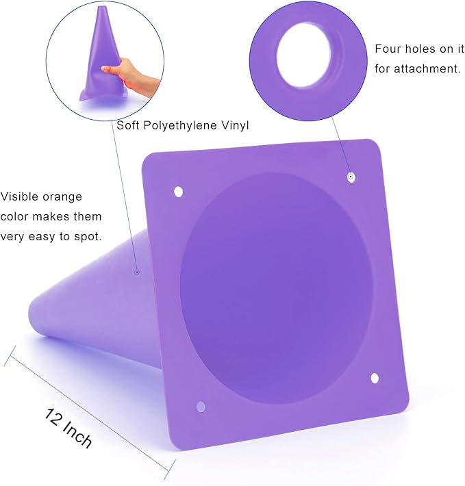 - Size - measures 12 inches in height, 6.7 inches in diameter. Four holes on safety cones for attachment, if it is a windy day, you do not need to worry it will blow all over the place.