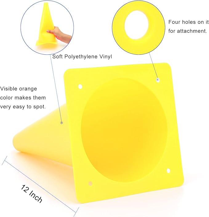 • Size - measures 12 inches in height, 6.7 inches in diameter. Four holes on safety cones for attachment, if it is a windy day, you do not need to worry it will blow all over the place.