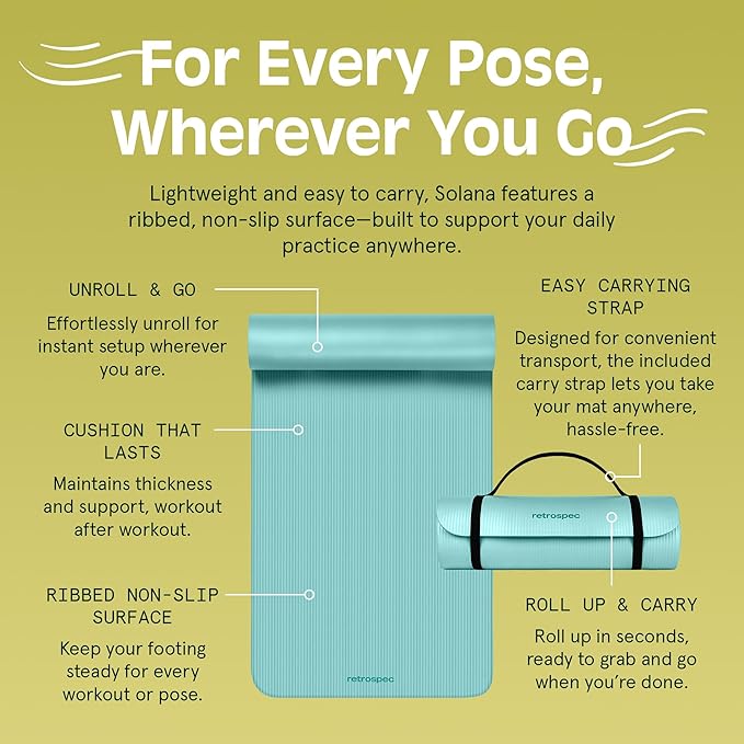 - EXTRA THICK FOR COMFORT & BALANCE: Solana firm 1-inch extra thick fitness mat w/ mat strap alleviates stress on pressure points such as joints, hips, hands, and knees. Solana measures 72" X 24" X 1".