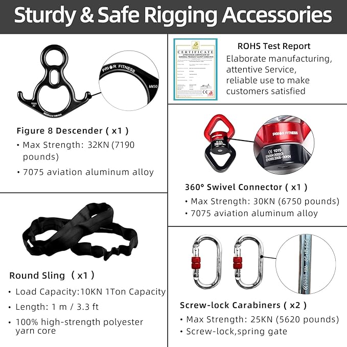 - 【Safety Tested & Guarantee】Aerial Silk is CE certified, SGS tested and recommended by certified aerial yoga teachers, Figure 8 Descender rated up to 32KN (7190pounds), 360°Swivel Connector (EN Certified) rated up to 30KN(6750 pounds), Round Sling Spanset rated up to 10KN(2248 pounds),Screw-lock Carabiners (CE & EN Certified) rated up to 25KN(5620 pounds)