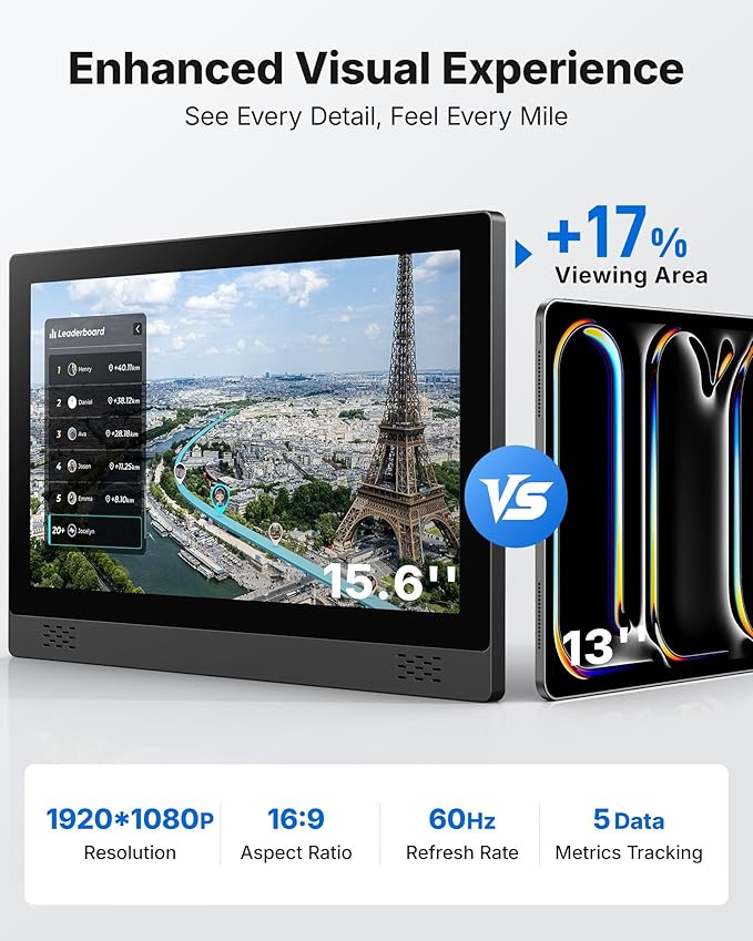 - All-in-One Fitness Tracking: Enhance your workouts with 15.6'' full HD (1920x1080P) fitness bike screen, offering crystal-clear visuals while tracking 5 key metrics in real time: time, speed, mileage, calories burned, and distance. Stay informed and motivated with every ride