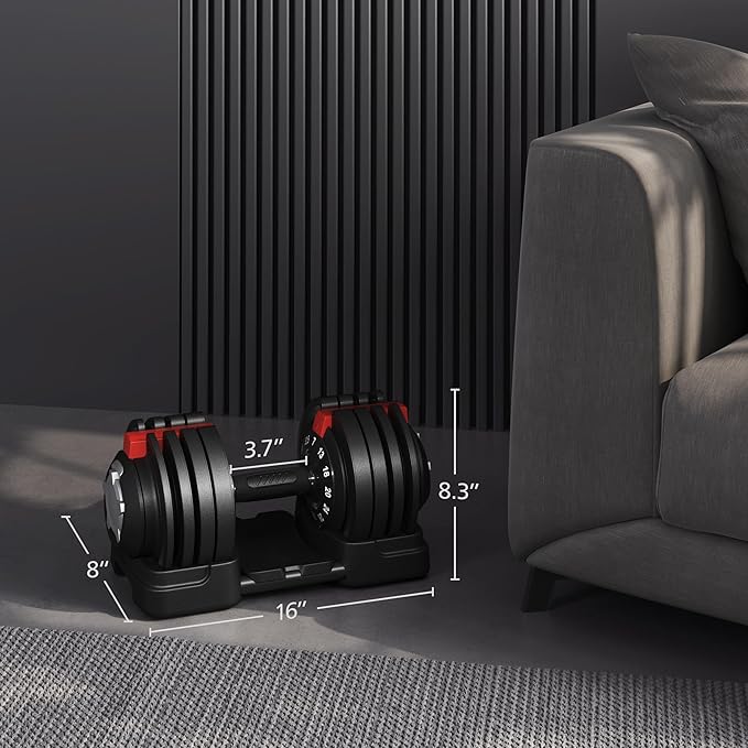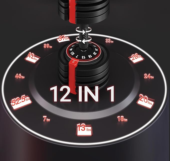 - 12-IN-1 ADJUSTABLE DUMBBELLS:This dumbbell set spans a wide weight range from 7 lb to 52.5 lb in diverse and smaller increments to facilitate gradual resistance, intensity, or volume adjustments.