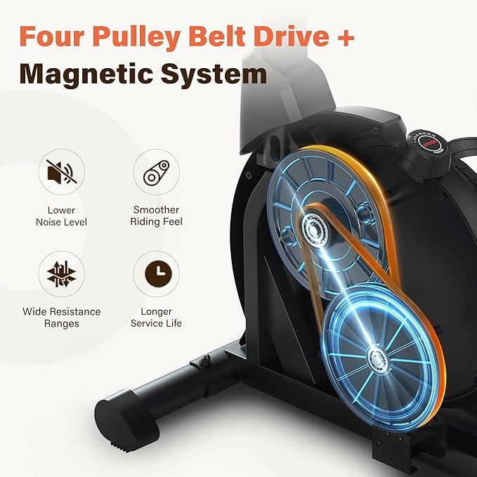 - 【Four Pulley Magnetic System】The SNODE RB10 Recumbent Bike features a quiet and smooth ride thanks to its advanced magnetic resistance system. The magnetic resistance provides a smooth and consistent workout experience, eliminating the noise and vibrations associated with traditional exercise bikes. The bike is also equipped with wheels for easy transportation and storage.