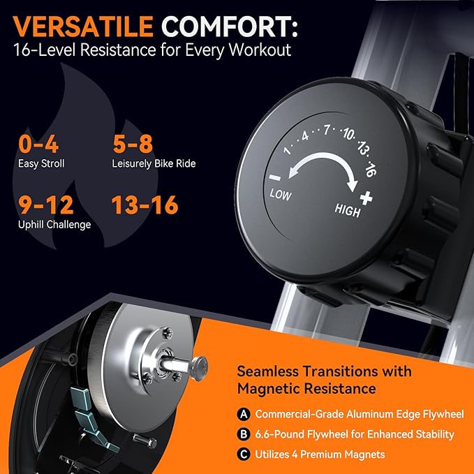 - 16-LEVEL MAGNETIC RESISTANCE FOR ULTIMATE WORKOUT CONTROL: Take your workout to the next level with our bike's 16-level magnetic resistance system! Equipped with four high-grade magnets and a 6.6-pound aluminum-rimmed flywheel, this indoor bike provides seamless and whisper-quiet resistance adjustments. Whether you're just starting out or a seasoned athlete, you can easily find the ideal challenge to push your limits.