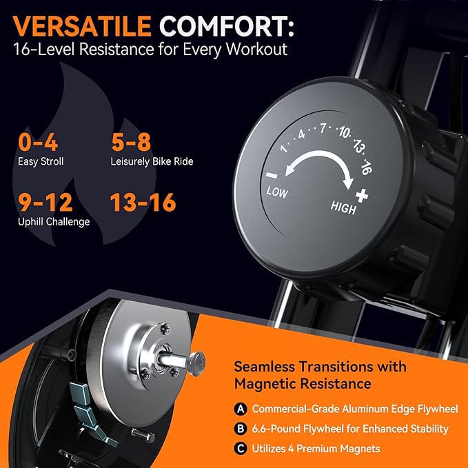 - 16-LEVEL MAGNETIC RESISTANCE FOR ULTIMATE WORKOUT CONTROL: Take your workout to the next level with our bike's 16-level magnetic resistance system! Equipped with four high-grade magnets and a 6.6-pound aluminum-rimmed flywheel, this indoor bike provides seamless and whisper-quiet resistance adjustments. Whether you're just starting out or a seasoned athlete, you can easily find the ideal challenge to push your limits.