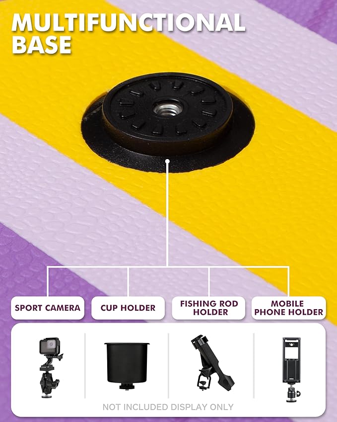 - 【Multifunctional base】The paddleboard multifunctional base can meet various needs. When you are traveling, you can install a cup holder so that you can replenish water anytime and anywhere without stopping, sitting down, opening your package, and so on. When you go out fishing, you can install a fishing rod bracket, place your fishing rod, or place your fish detector. When you want to record your wonderful moments of playing, you can install your sports camera or your phone holder, etc.