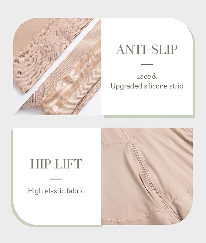 - BONUS FEATURES: Anti-Slip Design: Lace and silicone strips keep the shapewear for women securely in place. Hip Lift Effect: High-elastic fabric lifts and shapes your hips for a flattering silhouette