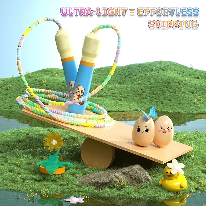 JGM Beaded Jump Rope for Kids – Adjustable Toddler Skipping Rope with Cartoon WOODEN Handle for Outdoor Activity Party Favors School Games 7.7 Feet