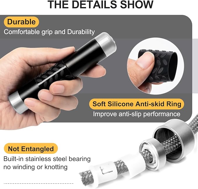 - Comfortable grip, strong practicality:The aluminum handles with silicone grips provide a comfortable, secure hold, while the raised texture ensures non-slip performance during high-intensity workouts. Ideal for Boxing, Double Unders, WOD, MMA, and CrossFit training